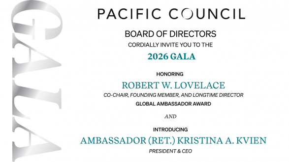 The Pacific Council Board of Directors invites you to join us this spring for the 2026 Gala as we gather to honor Board Co-Chair Robert W. Lovelace, a founding member, longtime director, and tireless champion of global policy engagement on the West Coast, for his decades of extraordinary dedication to our mission by presenting him with the organization's Global Ambassador Award. We are also delighted to welcome Ambassador (ret.) Kristina Kvien as she steps into her role as our new President and CEO.