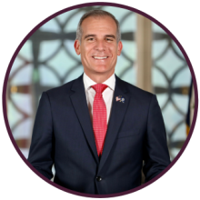 Previously, Garcetti served on the Los Angeles City Council for 12 years before winning election in 2013 as the youngest mayor in the city’s history and winning re-election in 2017 by the widest margin ever recorded. As Mayor, he brought about record low crime, record high jobs and business starts, and left behind the largest budget surplus Los Angeles has ever achieved. He won the bid for Los Angeles to host the 2028 Olympic and Paralympic Games, and Governing magazine named Garcetti Public Official of the Year.